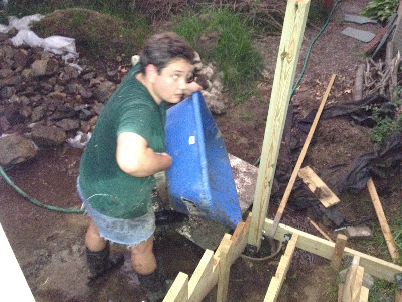 After all of the structure was in place for the stairs, it was time to fill the last foundation tube with concrete. Greg decided not to do this one when we had the original concrete delivery because he wanted to be sure where the stair structure needed to tie into the foundation, and to make sure that the height of the footing was correct as well,